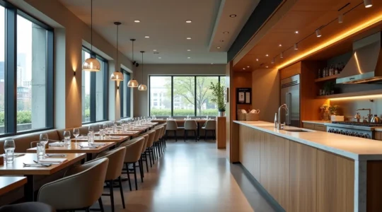 Quant à l’acoustique, les cuisines carrelées et équipées d’inox créent naturellement une forte réverbération. L’ajout de panneaux absorbants au plafond ou de dalles spécifiques peut réduire significativement le niveau sonore, facilitant la communication entre équipiers sans hausser le ton. Cette attention au confort sonore contribue à créer un environnement de travail plus serein, où les ordres sont compris du premier coup et où la tension reste maîtrisée même pendant les services intenses.